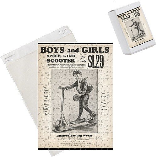 Photo Jigsaw, SPEED-KING STEEL SCOOTER. Speed-King all-steel scooter, offered for only .29 to any Boy or Girl who collects forty bottle tops from drinks manufactured by the Lansford Bottling Works. Chosen by Mary Evans. Bespoke 300 Piece Jigsaw Puzzle 17x12 (43x30cm). The jigsaw is delivered bagged and on a back board making a superb gift. Also supplied are a re-sealable bag, a photo example of the image and a self assemble flat packed